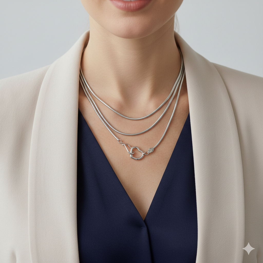 • Colar prateado com pingente de coração usado por mulher com roupa formal