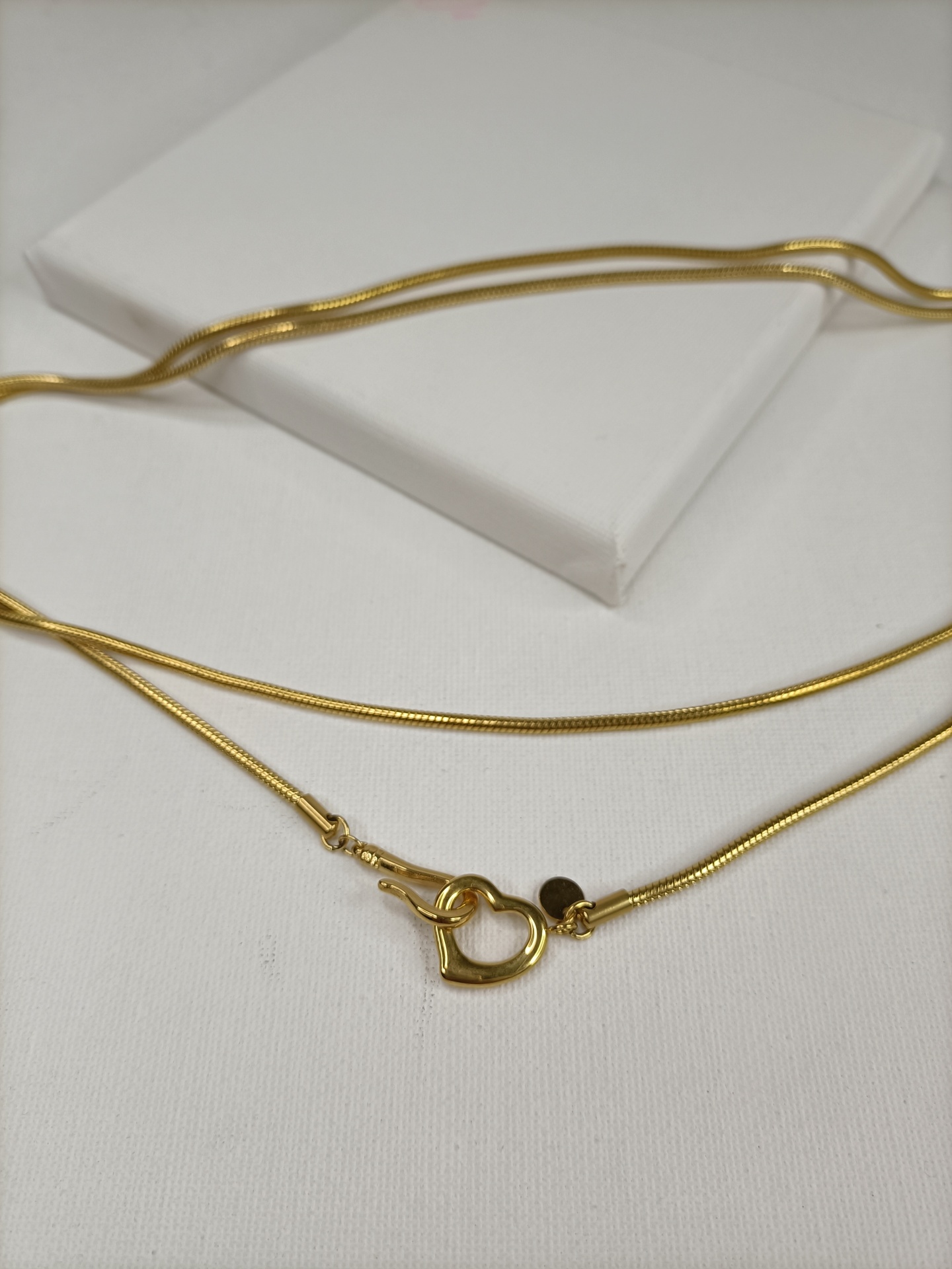 • Colar dourado com fecho em forma de coração sobre superfície branca