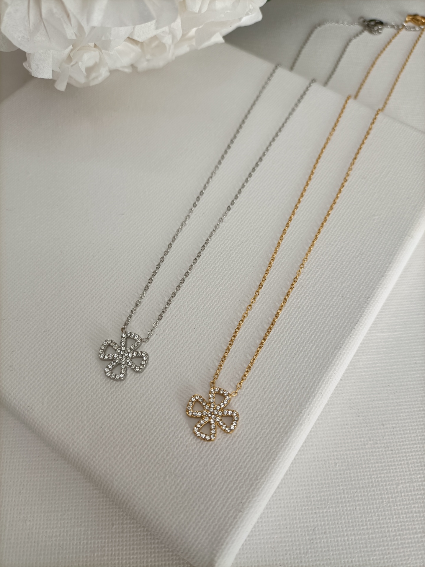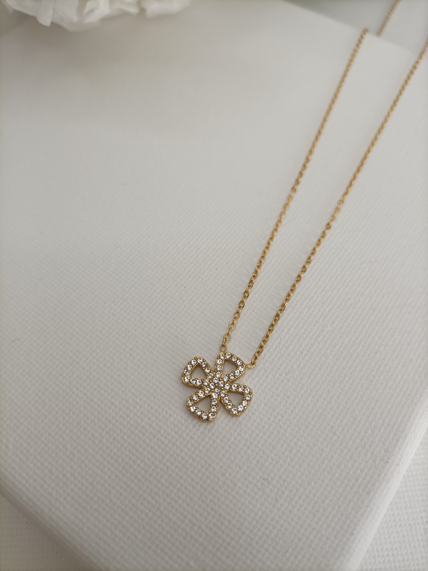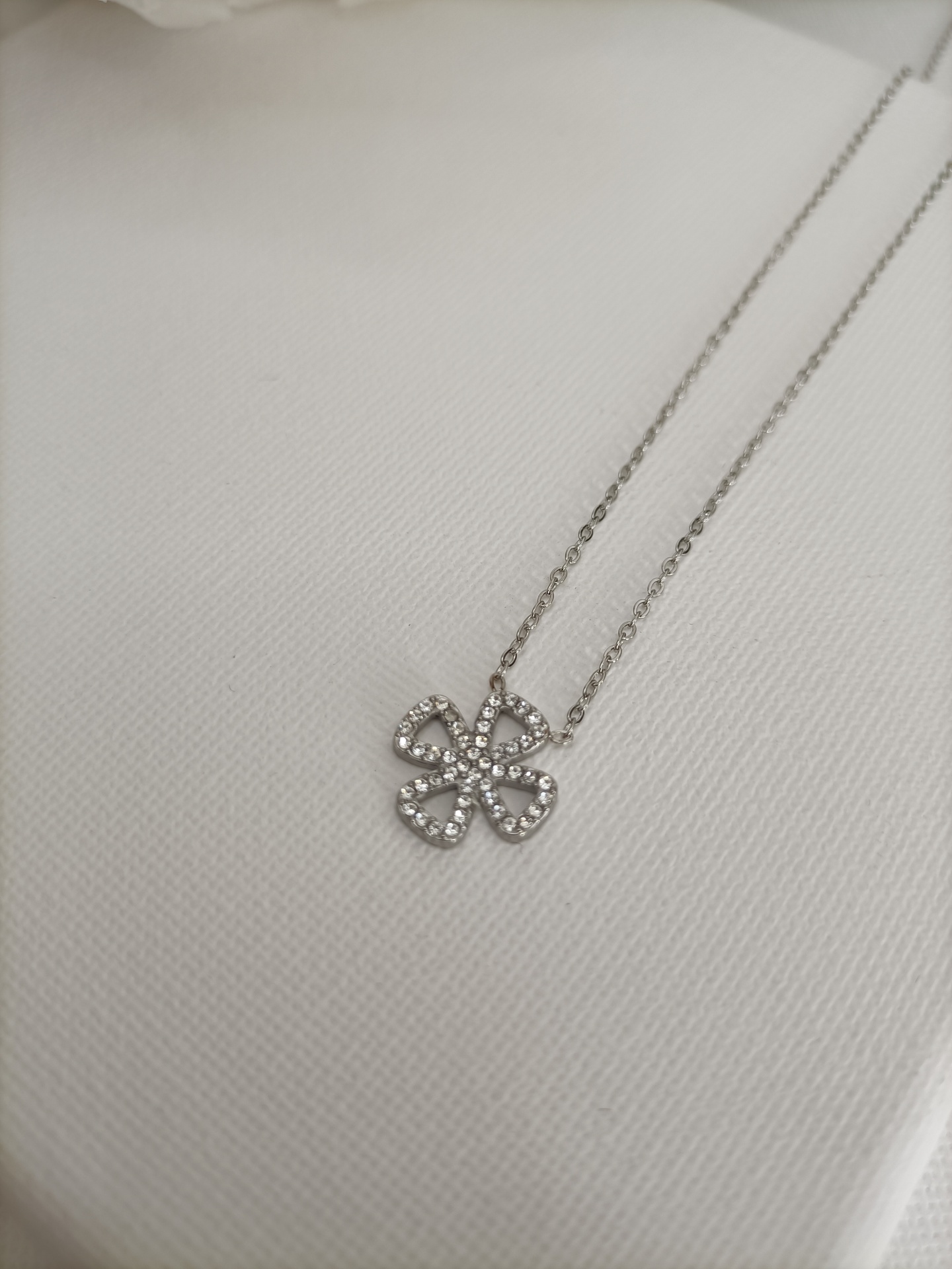 Colar Trevo 11,90 € Desconto de %. Partilhar Cor Dourado Prateado Comprar Contactar SKU: MB96 Colar com corrente fina e pendente trevo de quatro folhas cravejado de brilhantes. 🔸 Material: Aço inoxidável 🔸 Comprimento: ajustável (40cm + 5cm de extensão)