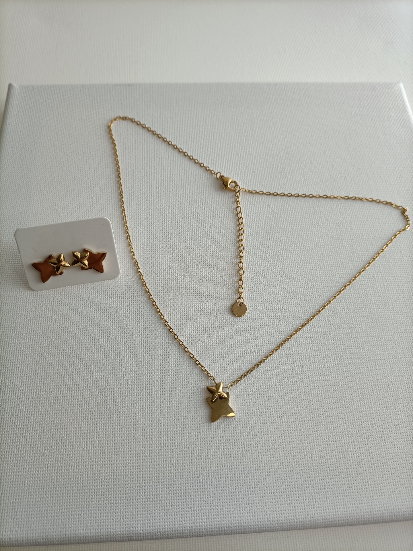 • Conjunto de colar e brincos dourados com estrelas sobre fundo branco.