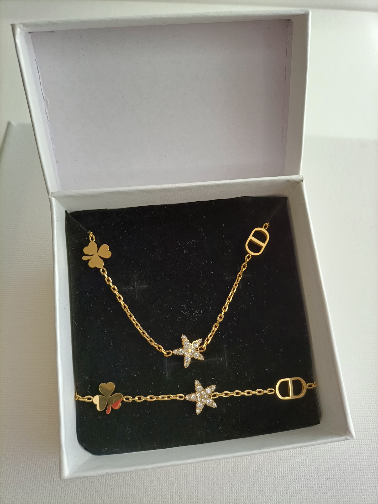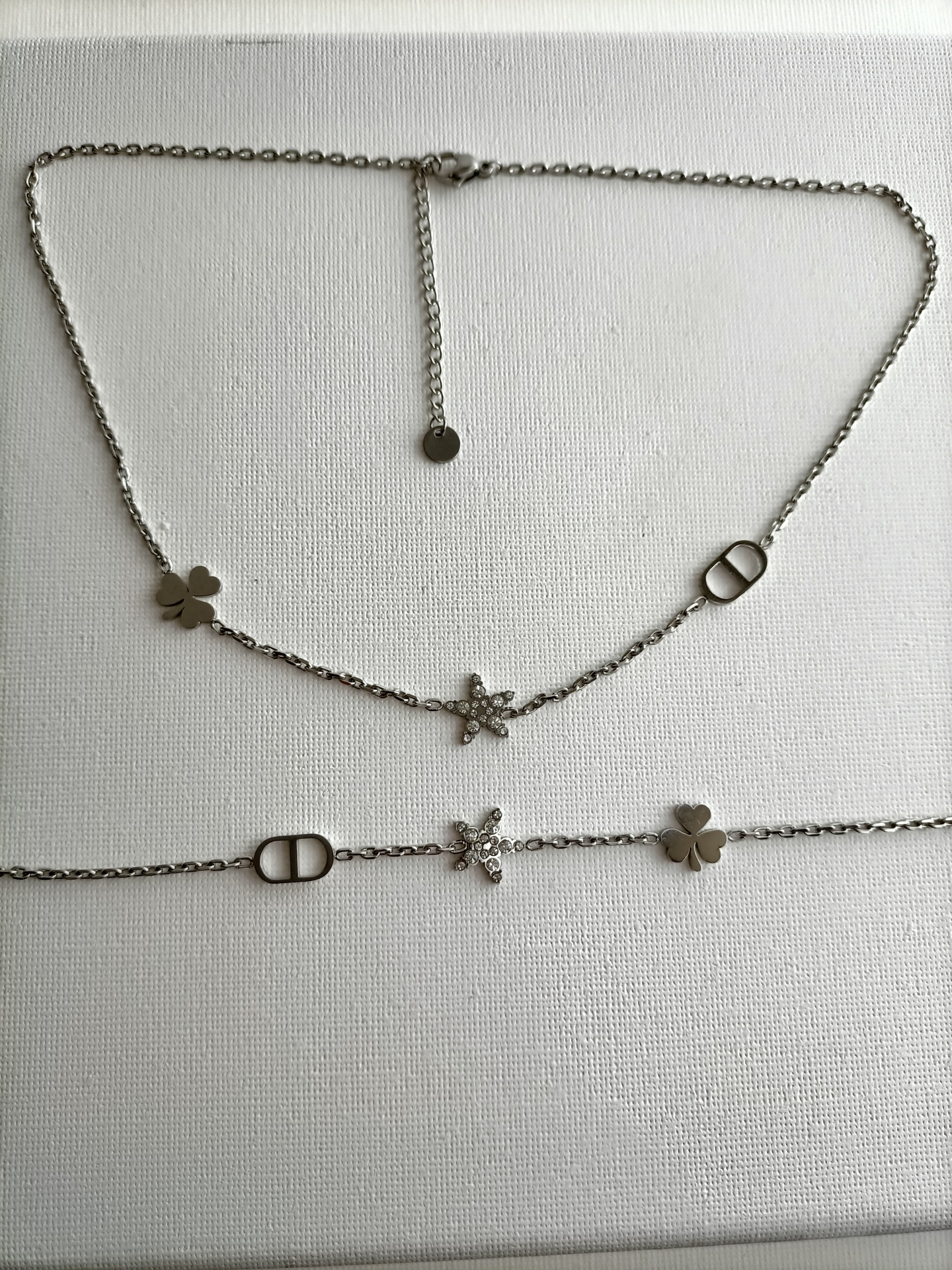 Conjunto 2 25,50 € Desconto de %. Partilhar Cor Dourado Prateado Comprar Contactar Delicado e intemporal, este colar em corrente fina com três peças: elo náutico, estrela com zircónias e o trevo da sorte. 🔸 Material: Aço inoxidável 🔸 Comprimento: ajustável (41cm + 5cm de extensão) Pulseira: 🔸 Comprimento: ajustável (17cm + 3cm de extensão)