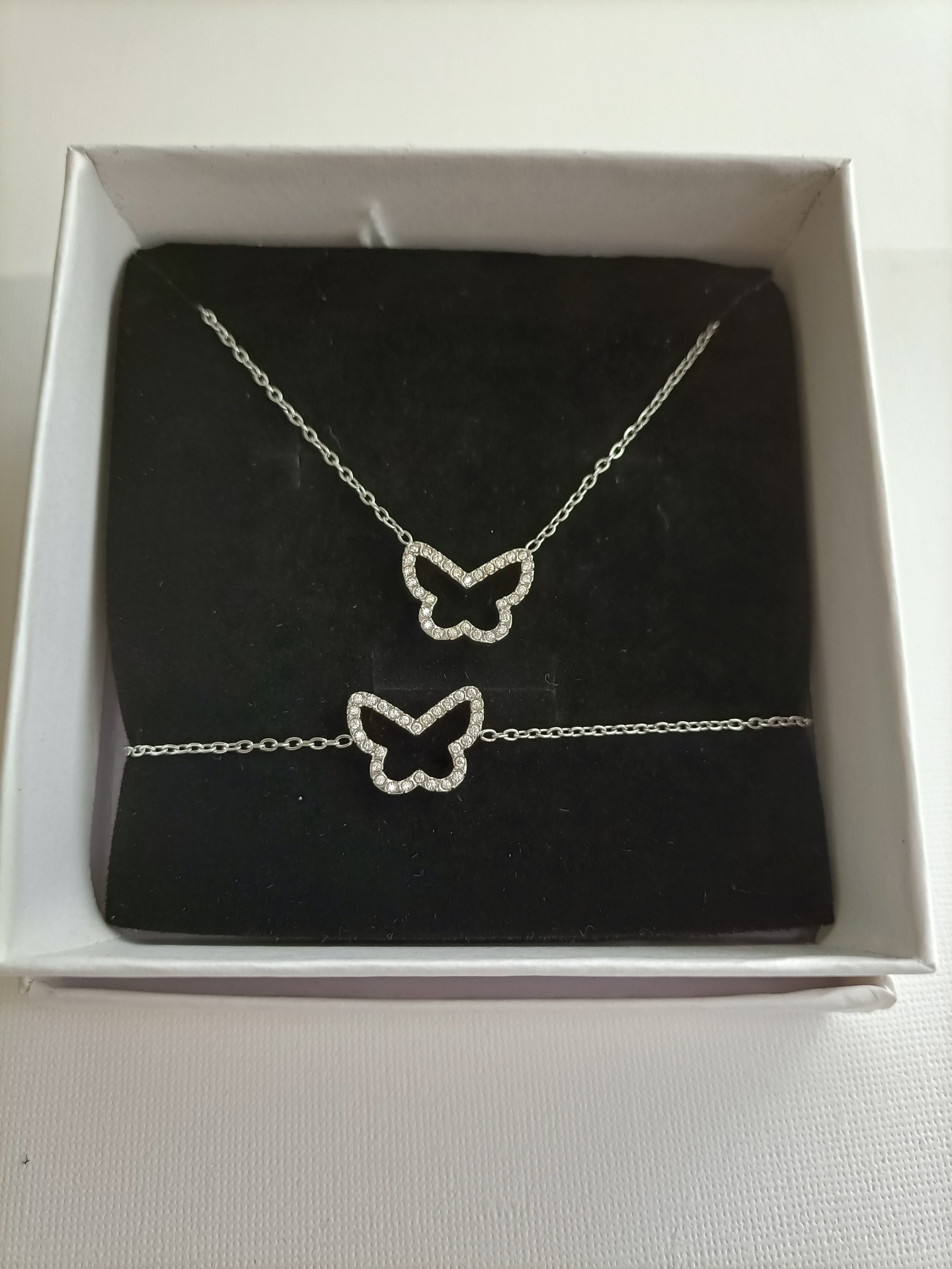 Conjunto 3 15,00 € Desconto de %. Partilhar Comprar Contactar Colar com corrente fininha e borboleta com contorno em zirconias. 🔸 Material: Aço inoxidável 🔸 Comprimento: ajustável (40cm + 5cm de extensão) Pulseira: 🔸 Comprimento: ajustável (16cm + 3,5cm de extensão)