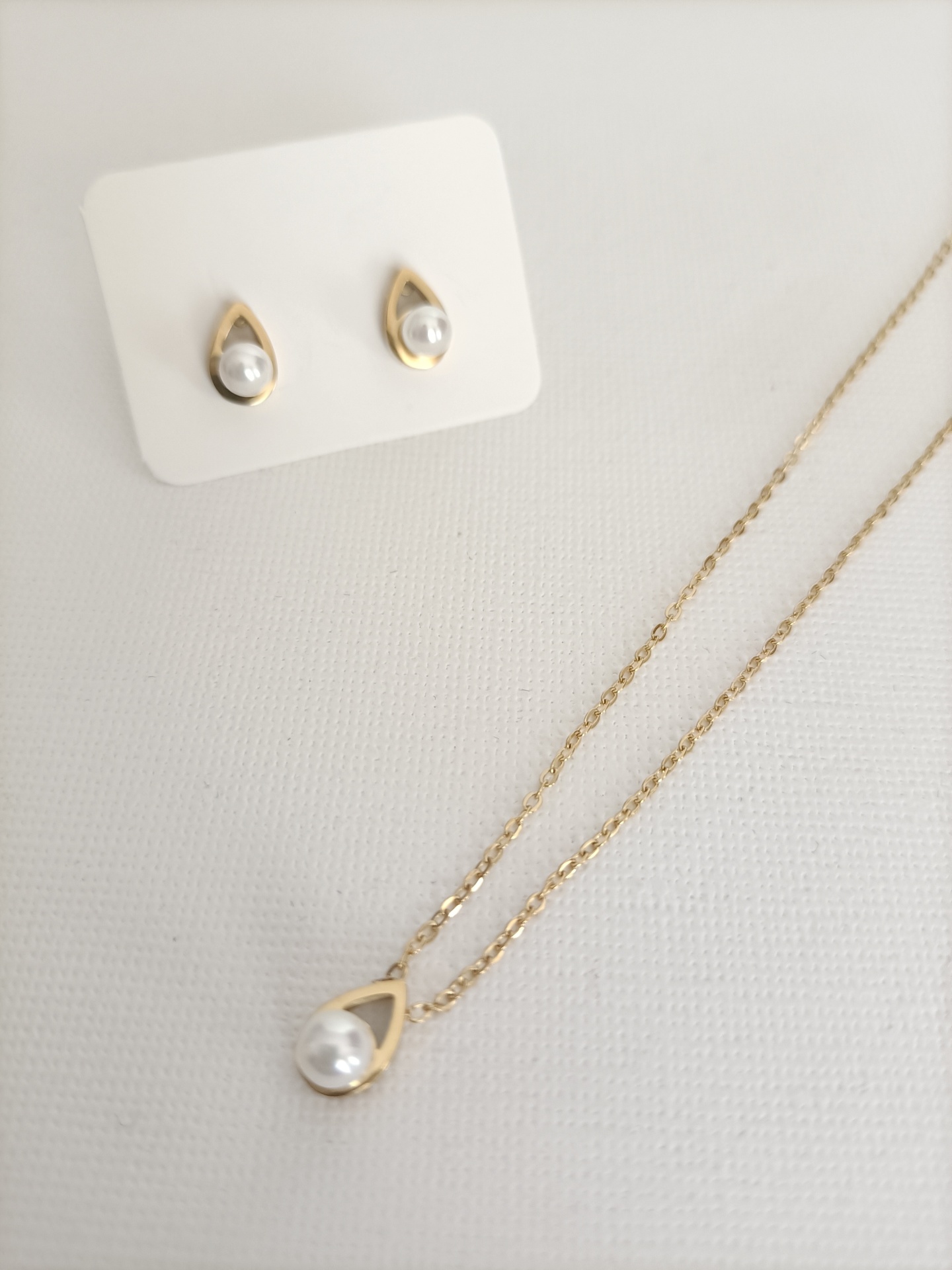 Conjunto delicado com pérola branca, composto por colar e brincos em formato gota. Um design clássico e sofisticado, perfeito para dar um toque de elegância a qualquer look.