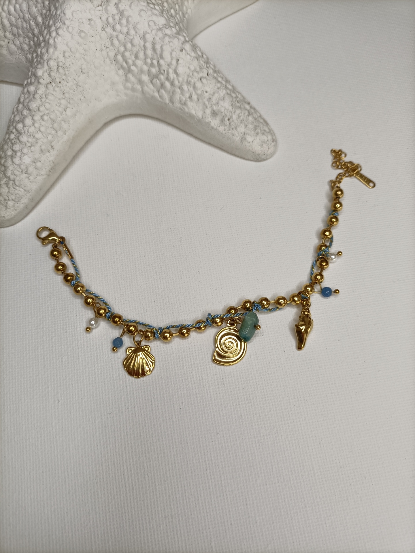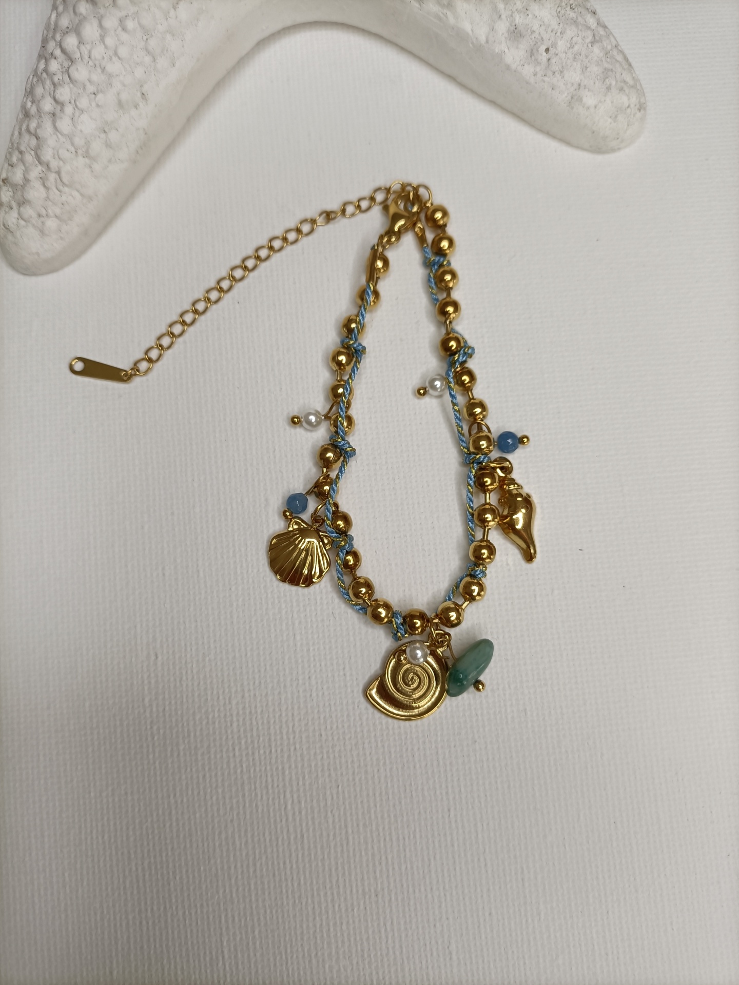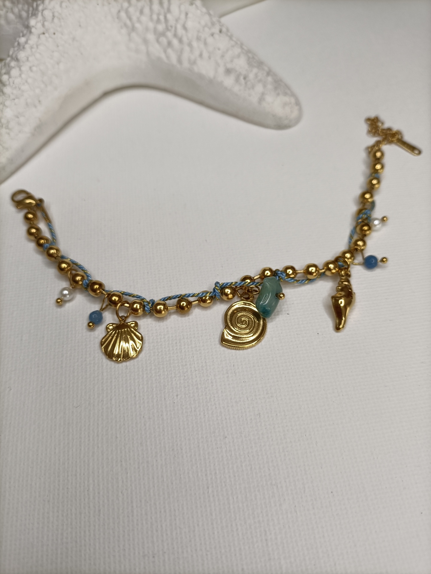 • Pulseira dourada com pendentes de concha, caracol e pequenas contas azuis sobre fundo branco