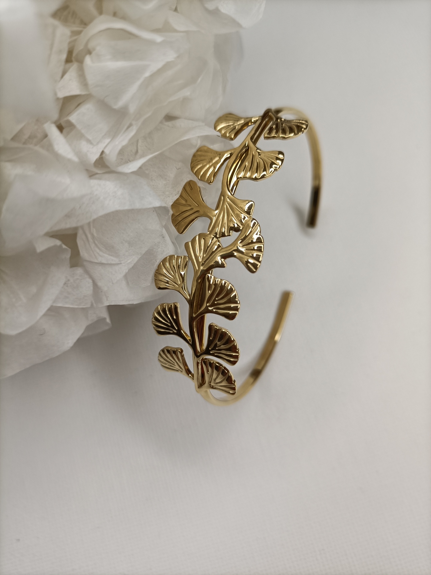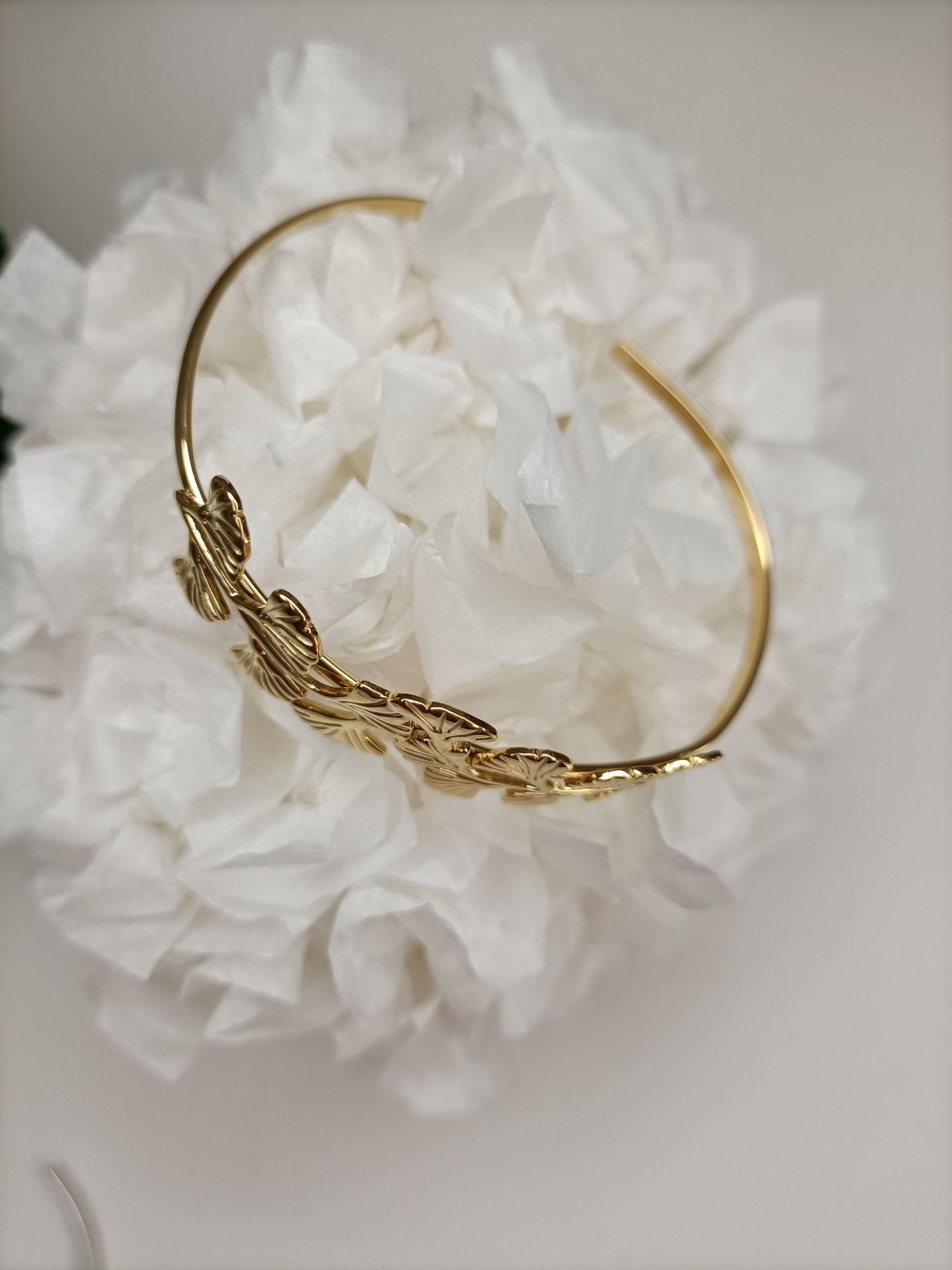 • Pulseira dourada com folhas detalhadas ao lado de flor branca