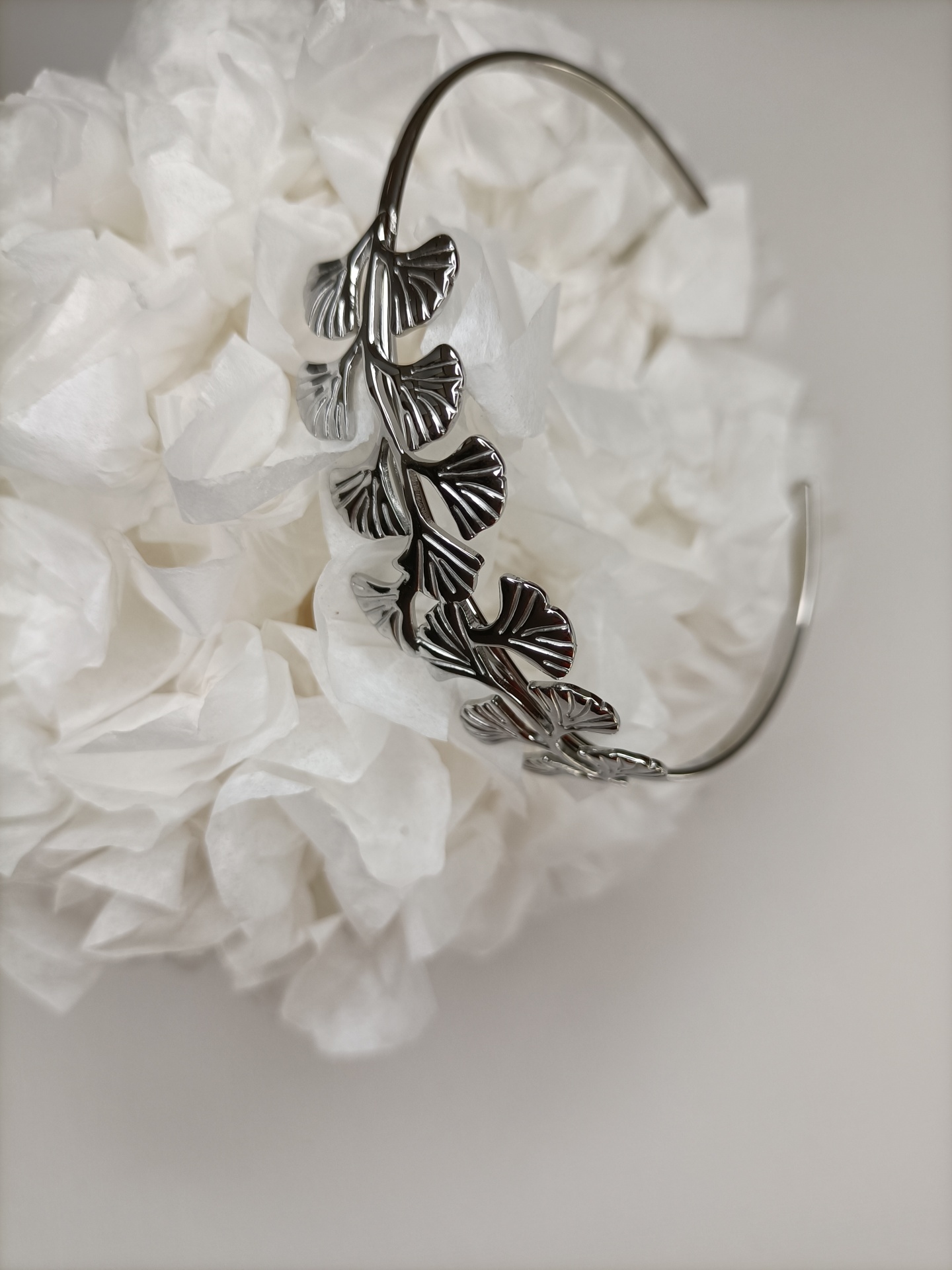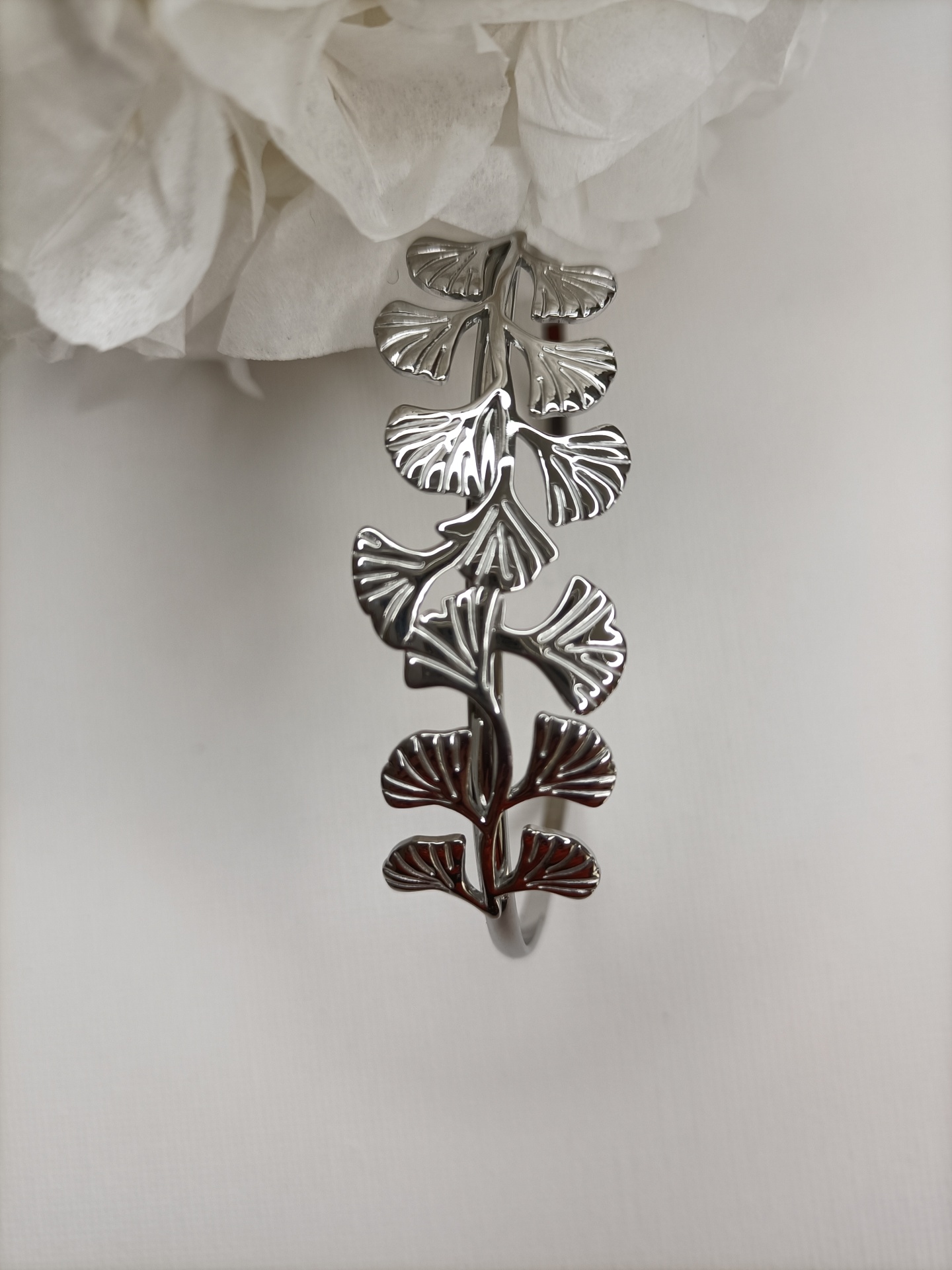 Delicada e sofisticada, esta pulseira é perfeita para quem procura elegância em cada detalhe com um design de folhas de ginkgo interligadas, criando um visual leve e feminino.