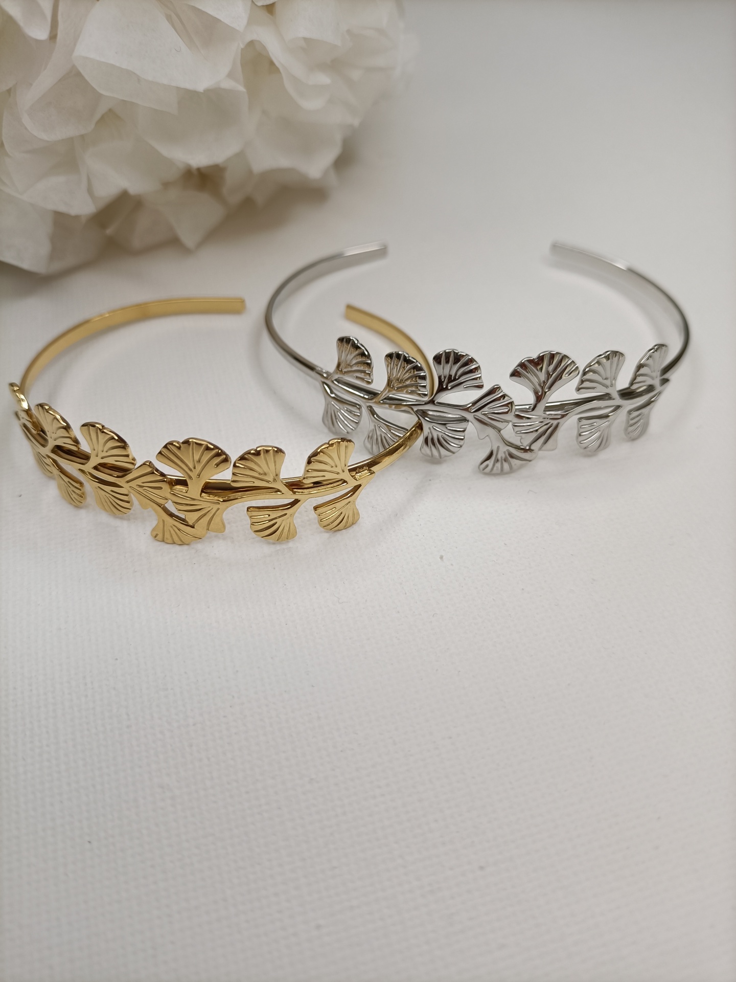 • Duas pulseiras com folhas dourada e prateada sobre fundo branco