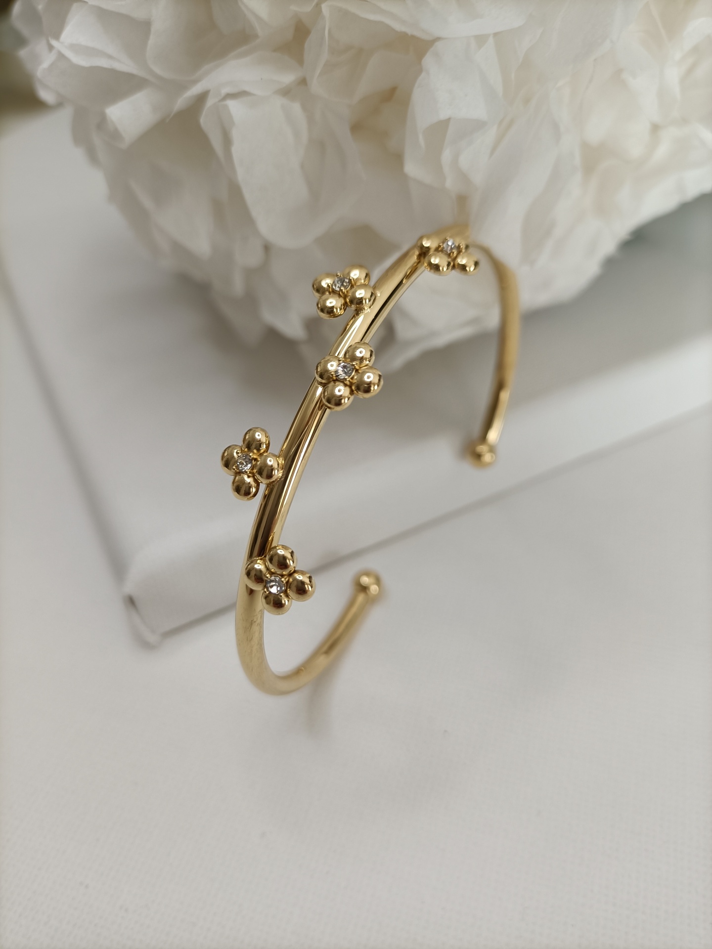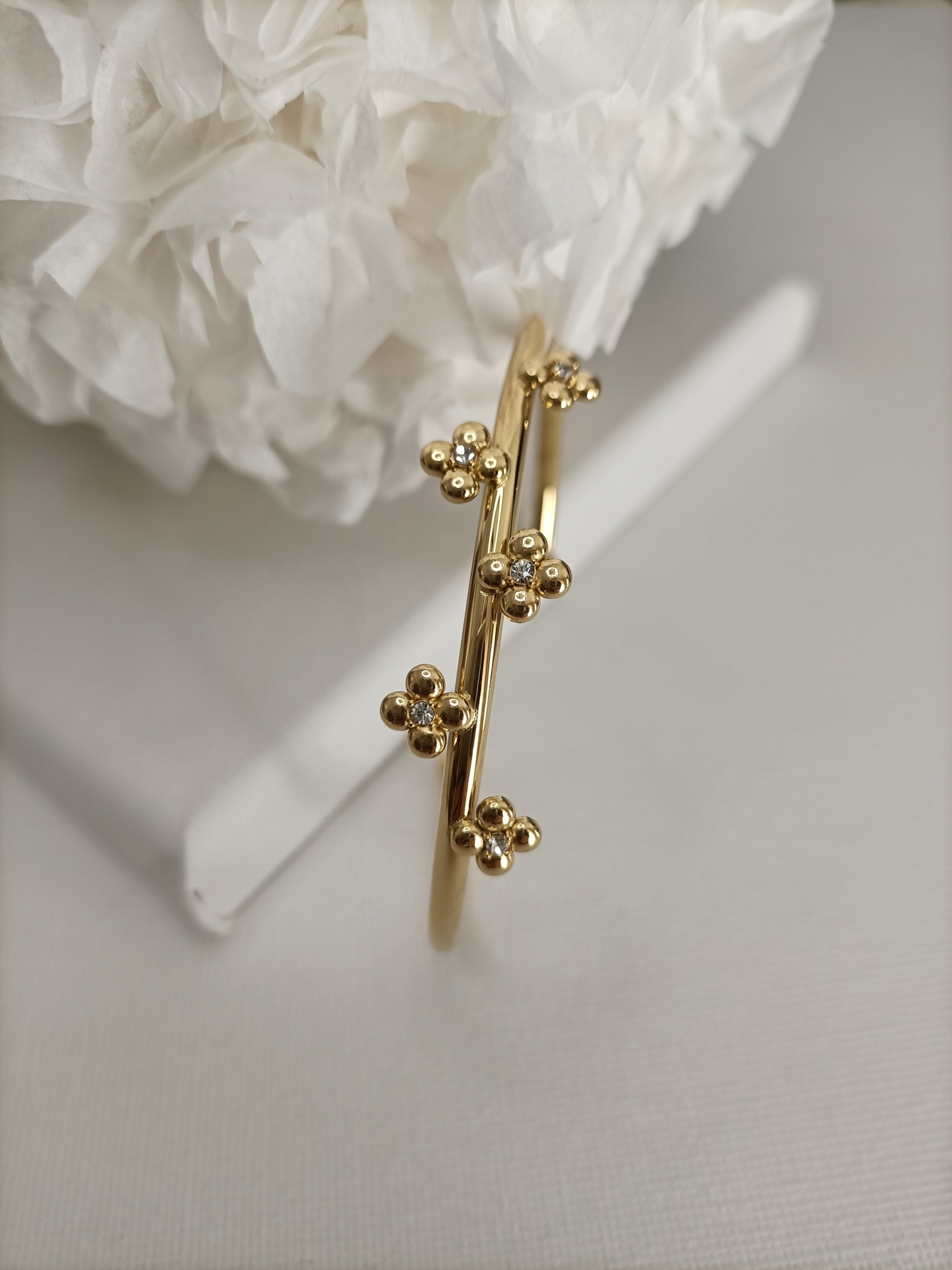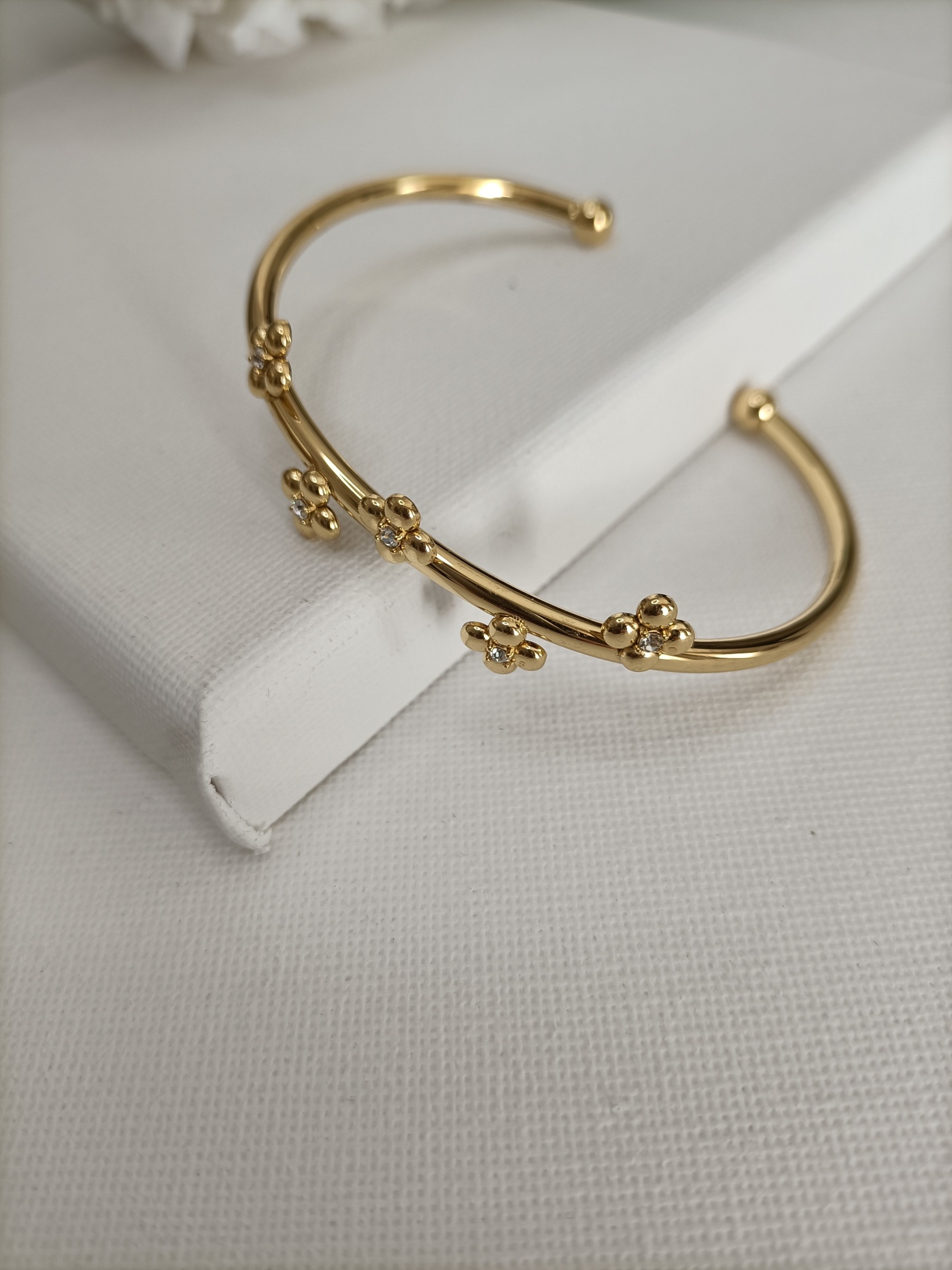 Pulseira Mia 12,90 € Desconto de %. Partilhar Comprar Contactar SKU: MB90 Pulseira rígida com pequenas flores com brilhante ao centro. 🔸 Material: Aço inoxidável 🔸 Diâmetro: 6cm (medida interior) ajustável
