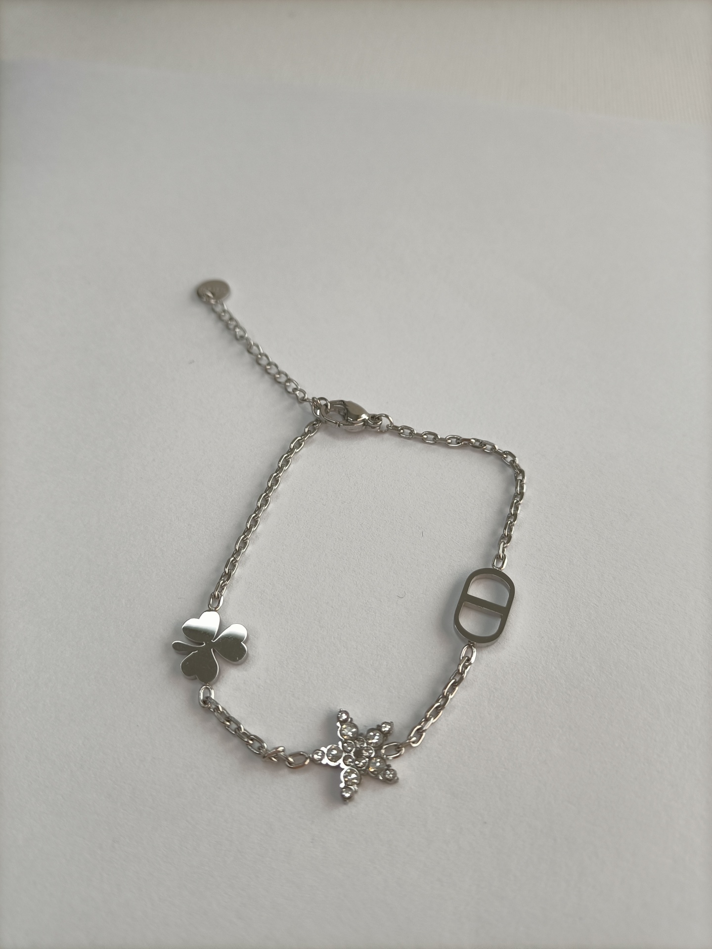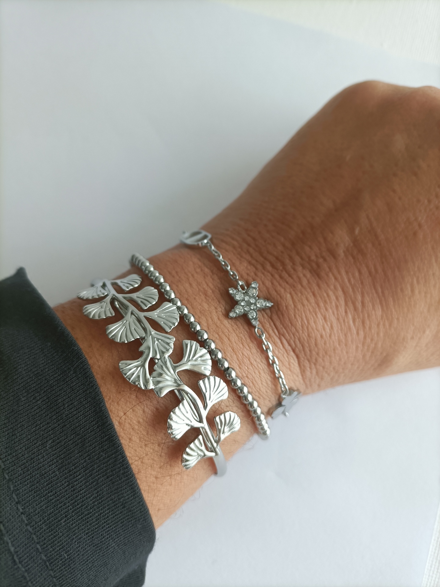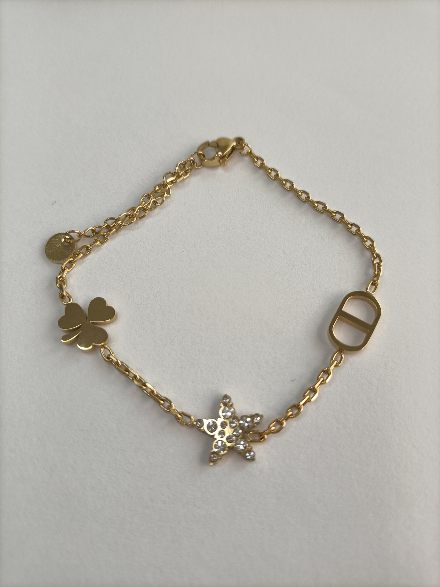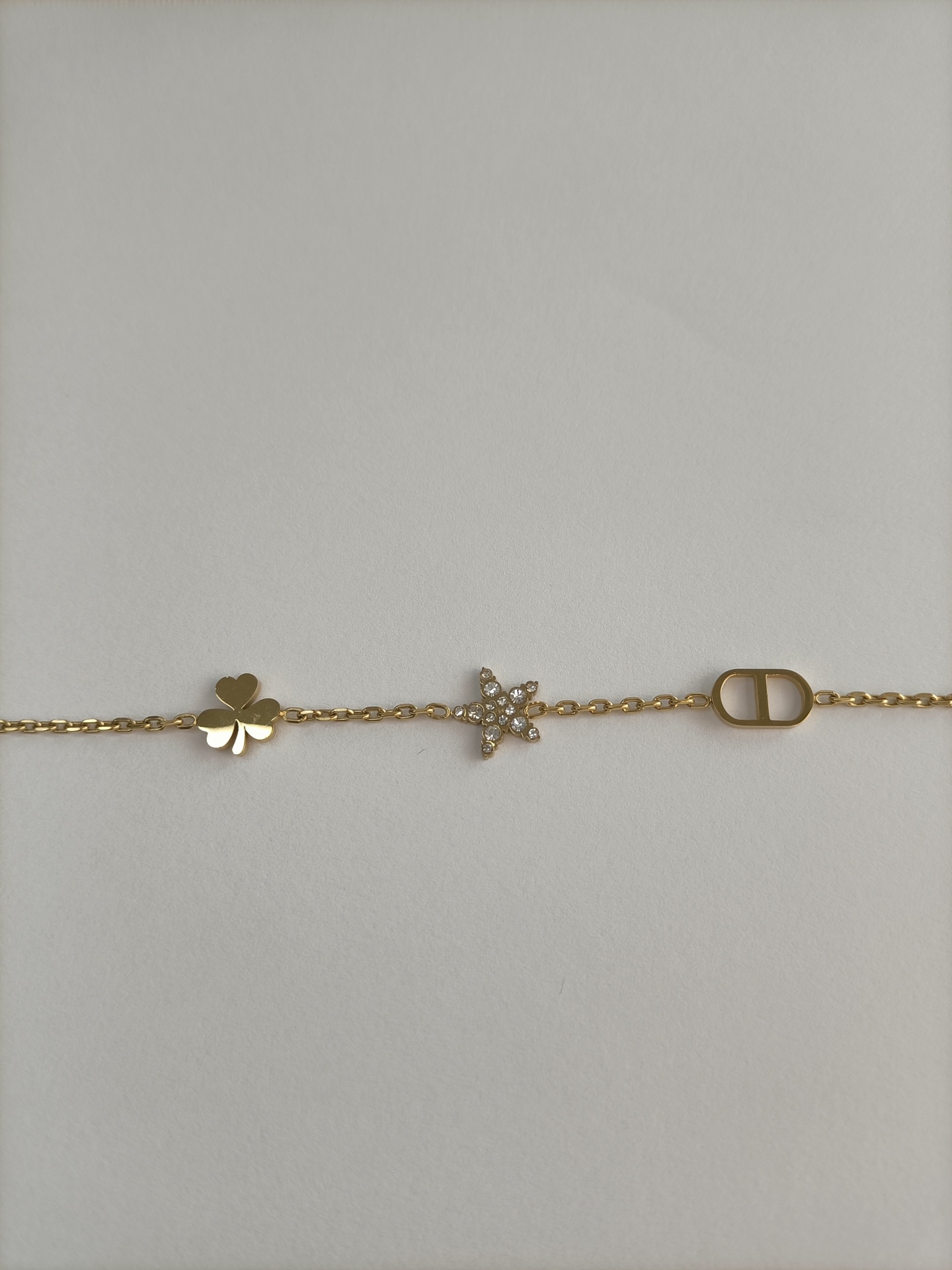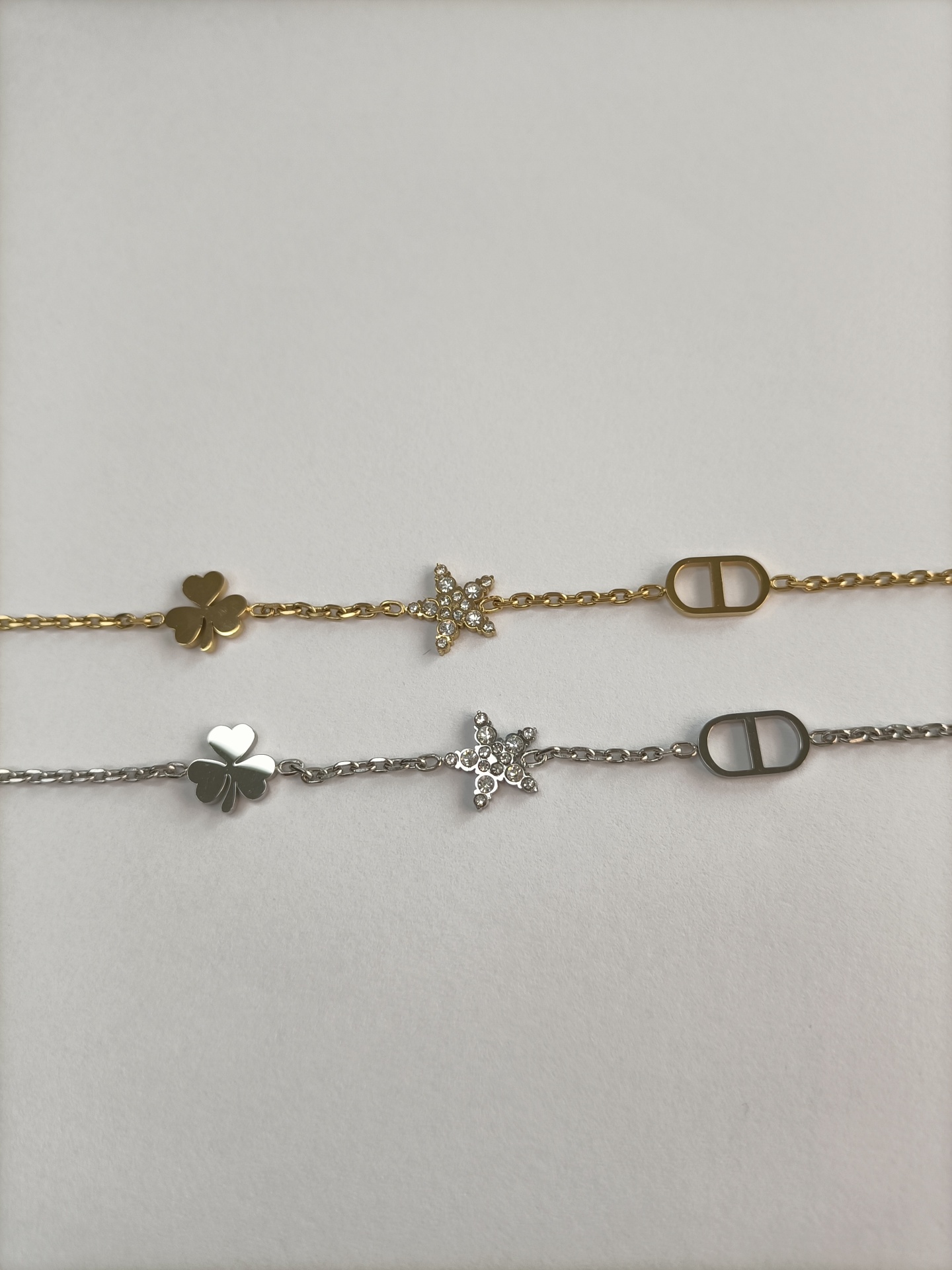 Pulseira Rosário 13,50 € Desconto de %. Partilhar Cor Dourado Prateado Comprar Contactar SKU: MB205 Delicada e intemporal, esta pulseira em corrente fina com três peças: elo náutico, estrela com zircónias e o trevo da sorte. 🔸 Material: Aço inoxidável 🔸 Comprimento: ajustável (17cm + 3cm de extensão)