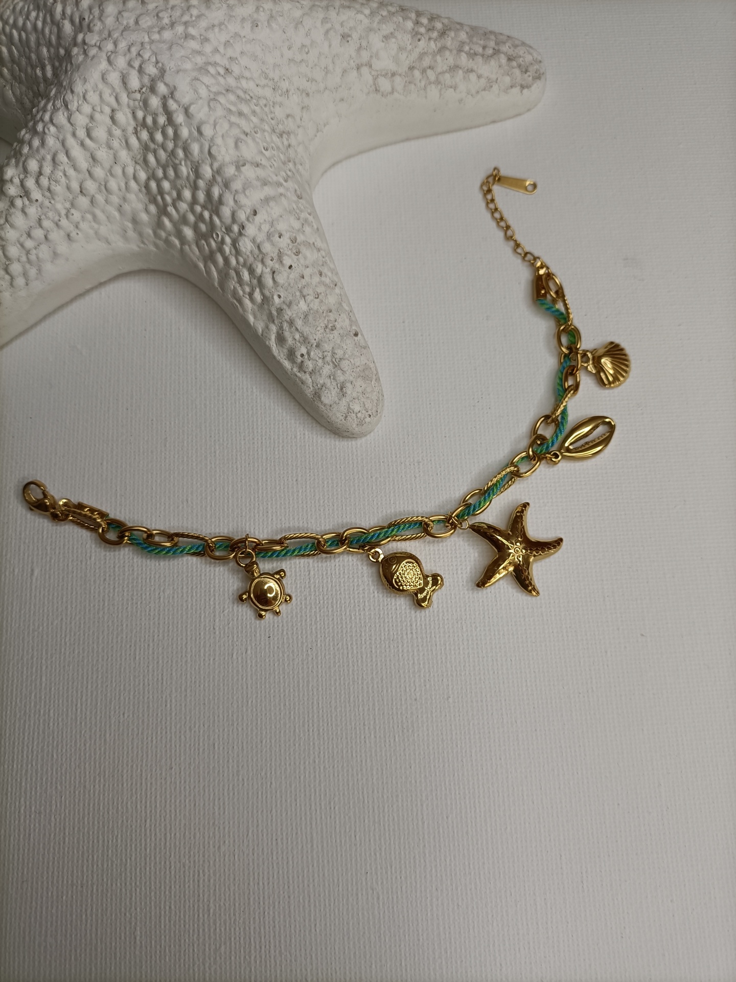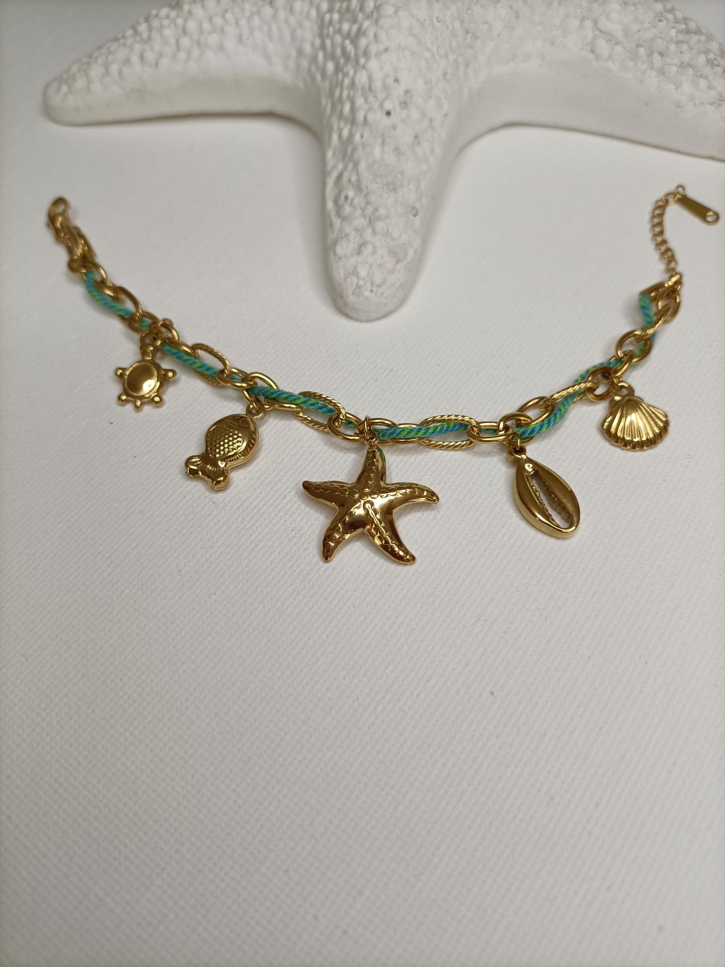 • Pulseira dourada com pendentes marítimos e fio azul entrelaçado.