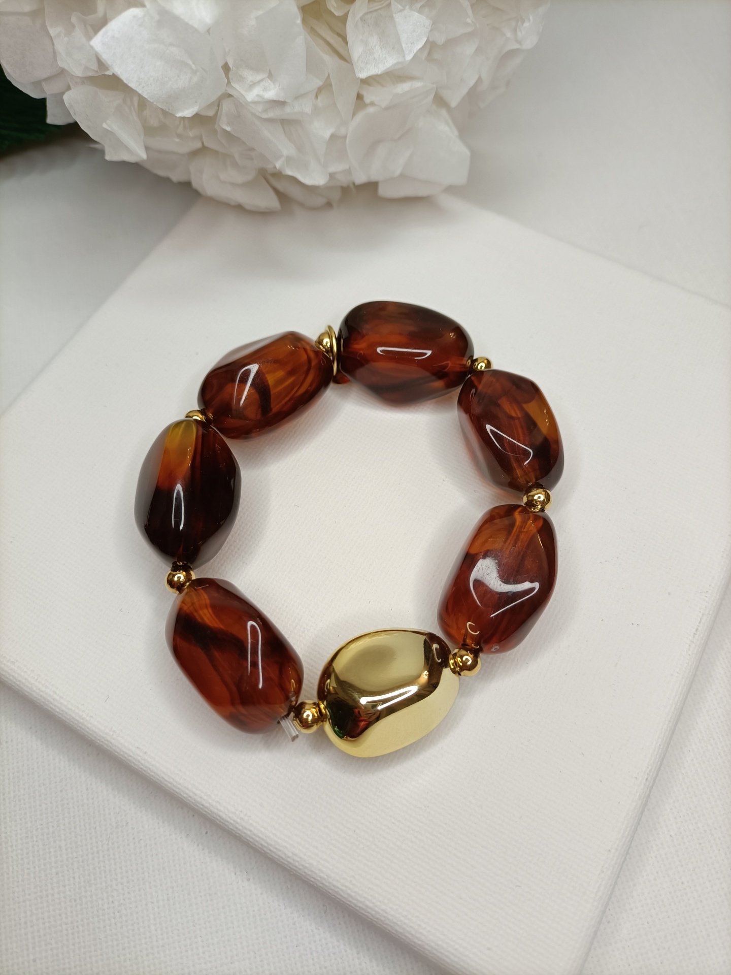 • Pulseira com contas de resina castanha e detalhe dourado sobre pano branco