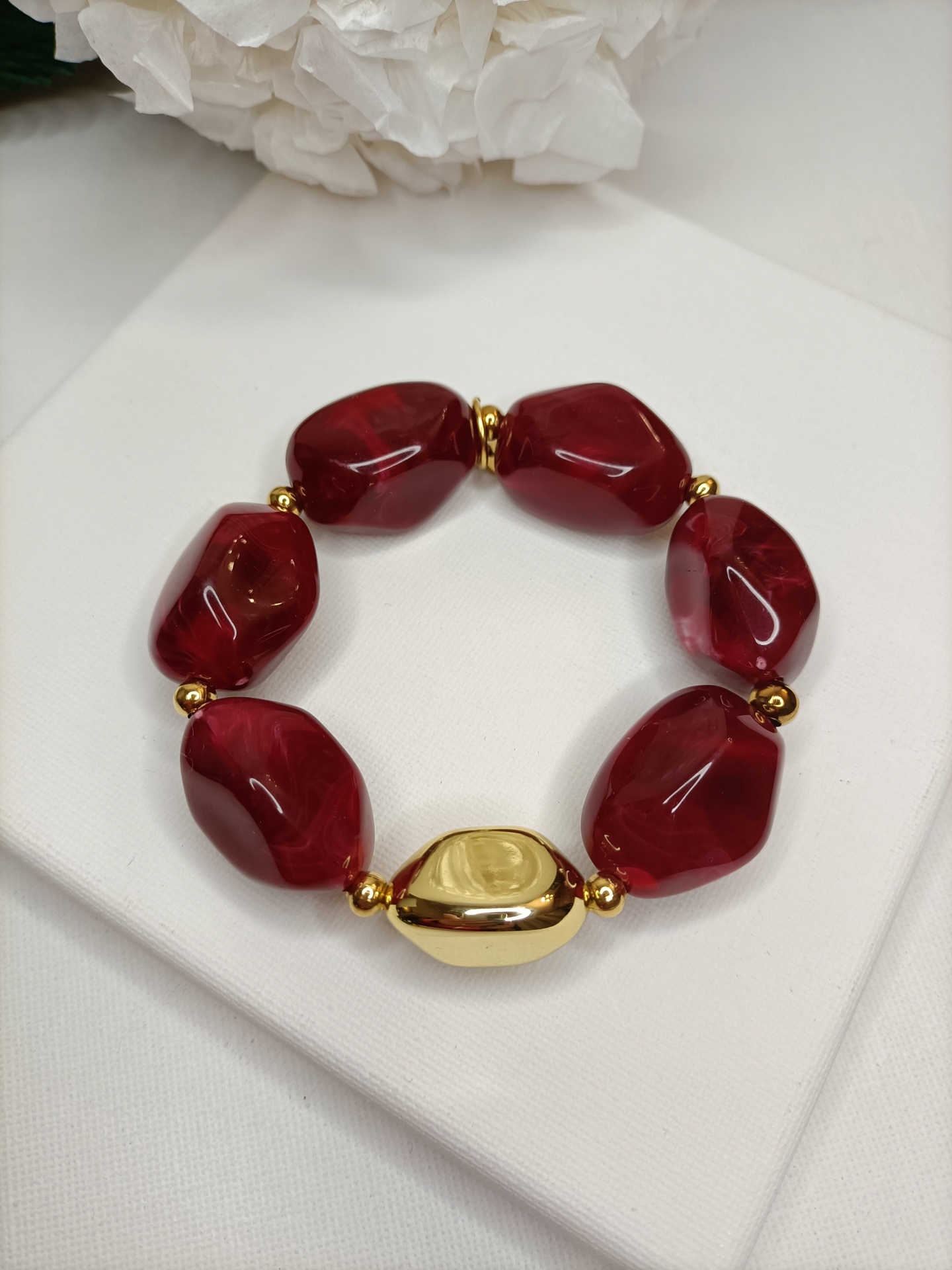 • Pulseira com pedras vermelhas e detalhes dourados sobre fundo branco