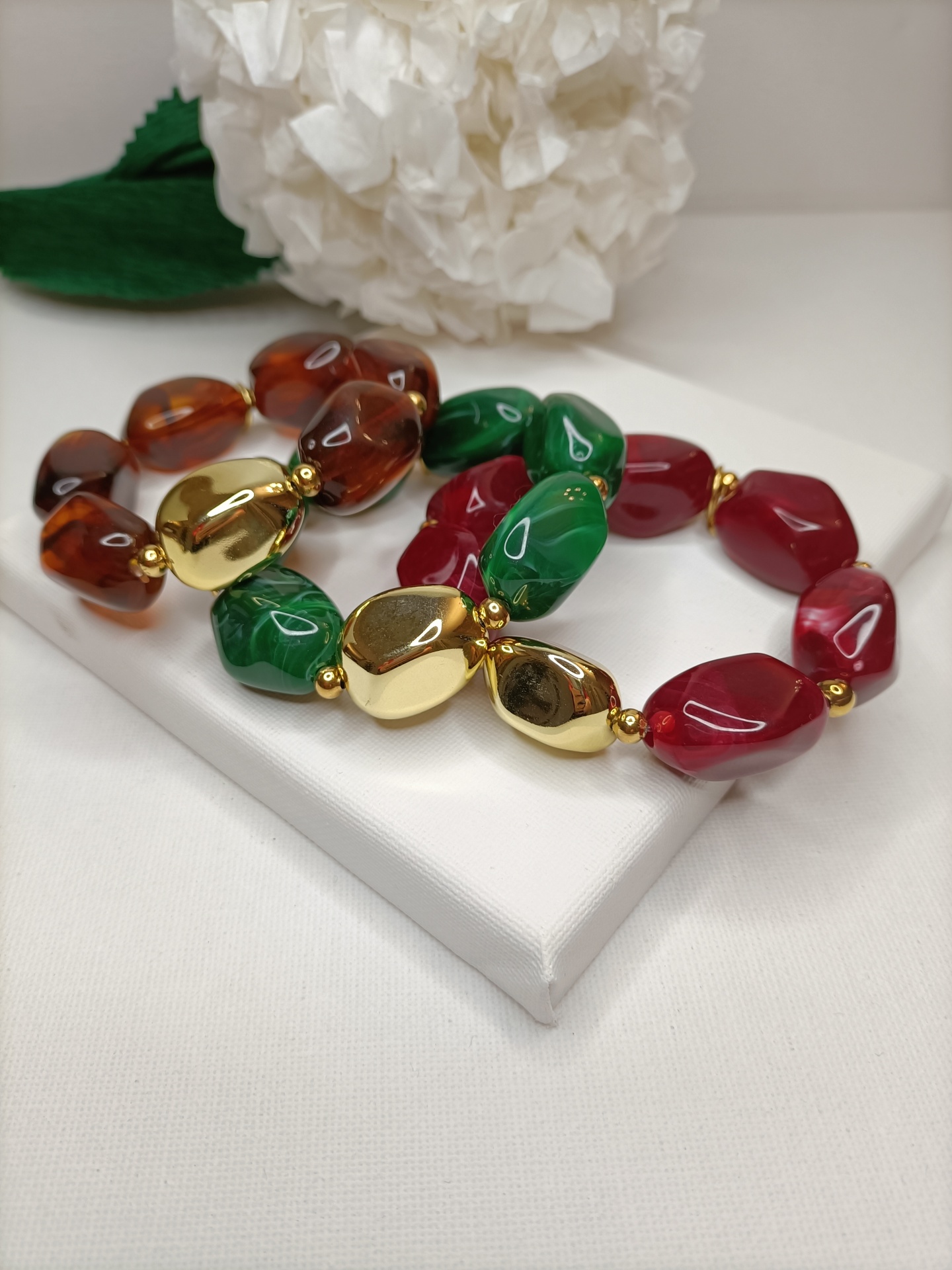 • Pulseiras coloridas de resina com contas douradas sobre caixa branca