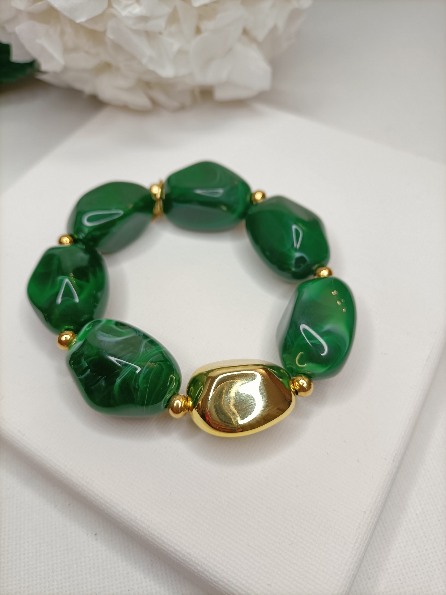 • Pulseira com pedras verdes e detalhes dourados sobre fundo branco